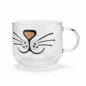 - Jolie Tasse transparente où est dessiné sur la face extérieure un museau de chat: on distingue le nez rose, les joues blanches et les grandes moustaches qui partent sur les côtés.